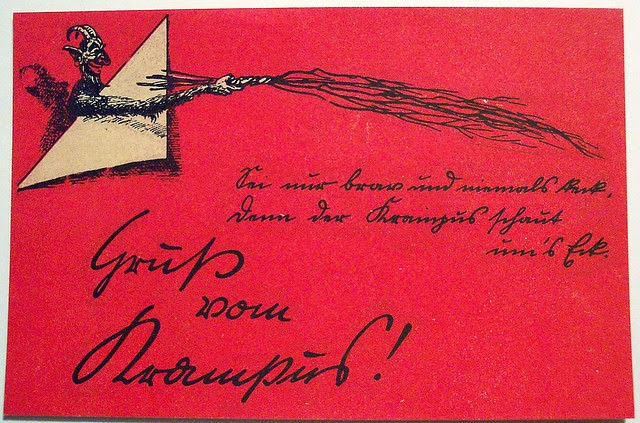 (The rhyme on the wall on the last page is from a traditional Krampus postcard; it means, "Just be good and never cheeky, because the Krampus is looking around the corner.")
