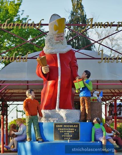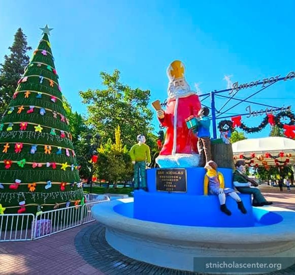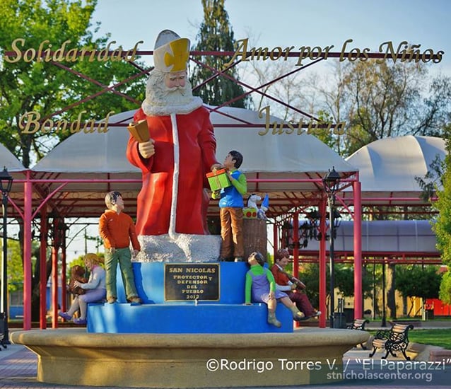 The fountain with San Nicolás stands in the Plaza of the Children. It was installed in 2012. San Nicolás de Bari is the protector and defender of the town; the patron saint. The sign says "Solidarity; Love for Children; Kindness; Justice." Before Christmas the fountain is joined by a Christmas tree and it is the site for collecting gifts for children whose families lack resources.