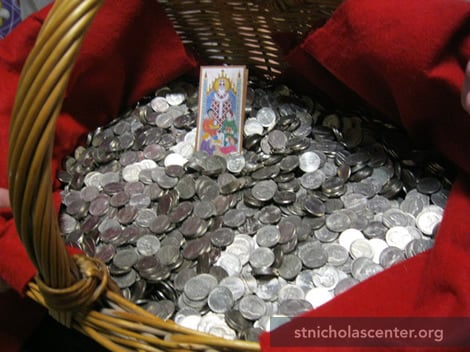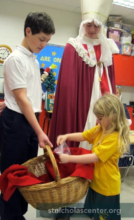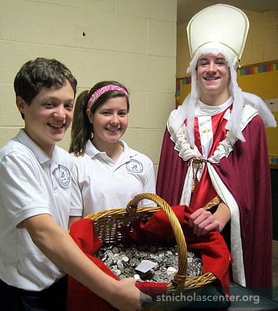 Nickels for St. NicholasIn the three weeks before St. Nicholas Day, students in all grades collect nickels to give St. Nicholas to support area residents in need. They search backpacks, pockets, and furniture. They dig into piggy banks and ask family and friends to contribute, too. An 8th grade student is selected to be St. Nicholas. Together with assistants, he travels through the school, ringing a bell and asking for donations of nickels. When all classes have been visited, the large basket overflows with thousands of nickels. "Nickels for St. Nicholas" is one of the school's most popular activities. The project supports a different children's charity each year.