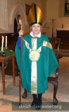 St. Nicholas Day School ServiceThe whole Church of England Primary School (about 90 pupils), and parents and governors who are able to come, meet in St Nicholas’ Parish Church on the afternoon of St Nicholas’ Day. There may be a presentation by some of the children, and certainly a reading. The main part of the celebration is a short service of installation of a boy or girl bishop. The bishop designate is chosen by the school staff, and installed on the church’s Bishop’s Chair at the chancel step. The bishop alternated from a Year 4 boy to a Year 4 girl. A parent made the set of episcopal vestments and the mitre. The tradition started here in 2000, when the Archdeacon of Winchester installed the first Boy Bishop of Longparish. Our intention was to emphasise the generosity of St Nicholas by giving each child a gold coin on leaving!