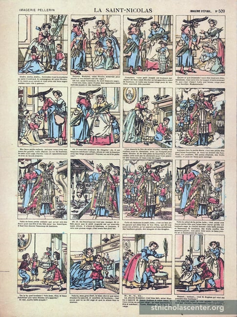 LA SAINT-NICOLAS Epinal Print Imagerie Pellerin Épinal, France ca 1900 11 5/8 × 15 5/8 inches Story of St Nicolas' visit with Fouettard is told in sixteen frames These sheets were sold as popular "one-cent images"