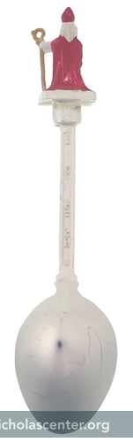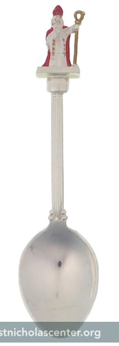 Sinterklaas Spoon A.P.W. The Netherlands, made in UK 2000 Silverplate, enameled Sinterklaas on top 4 1/2 inches Click for back view