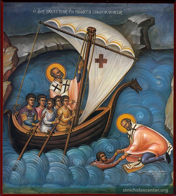 St Nicholas, Help of Mariners Icon Print St. Isaac of Syria Skete Boscobel, Wisconsin, USA 1996 Print laminated on wood 8 3/4 x 7 7/8 inches Available from Saint Paul the Apostle Orthodox Monastery