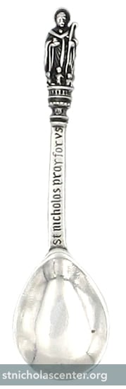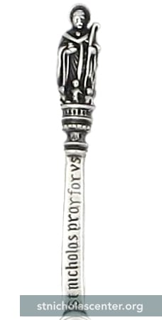 ST NICHOLAS PRAY FOR US Christening Spoon England UK 1910 Silverplate 5 inches Christening 'Saint' Spoons were once commonly given at the time of Baptism. They were a useful gift which helped teach children about their name-day saints. This one is from England.Registry Number 574577 Click for detail and for back views