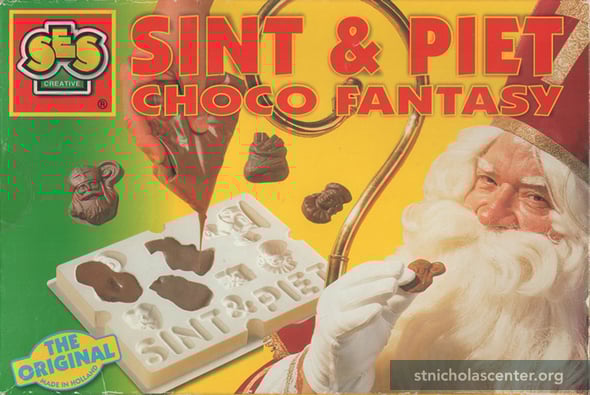 SINT & PIETChoco Fantasy Chocolate Molding Set SES Creative The Netherlands 1999 Plastic candy mold 7 3/4 × 5 3/4 inches Mold has cavities for a Sint, Sint on a horse, heart, package, sack, and two Piets, plus letters Click for mold