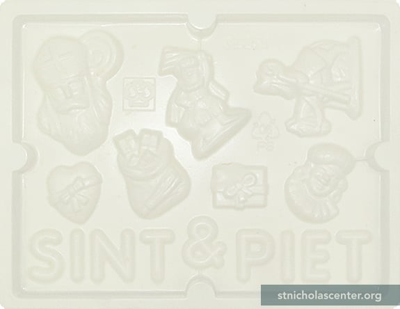 Mold has cavities for a Sint, Sint on a horse, heart, package, sack, and two Piets, plus letters