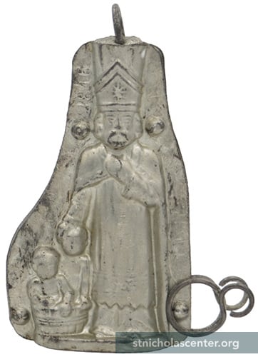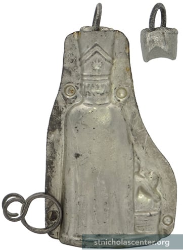 Chocolate Mold Anton Reiche Dresden, Germany German silver 2 1/2 x 4 1/8 inches; 4 inch figure #2846, an "8" on the back Open top has a separate plug to shape the miter; figure is thin Side view Back view Click for "chalkolate" figure from mold Click for Chalkware figure