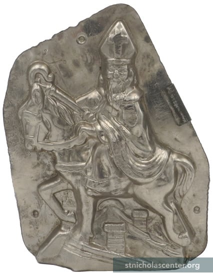 Chocolate Mold de Lille Brugge, Belgium Tin 5 1/2 x 7 1/4 inch figure #15932, mold introduced in 1958de Lille distributed molds made by the Dutch company Vormenfabriek Click for back view Click for papier mâché figure