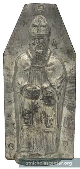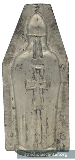 Chocolate Mold Jos. Fohn Vienna, Austria German silver 2 1/2 x 5 1/2 inches; 5 1/8 inch figure #4 on front; #5 on back (mismatched) Click for back view Figure from mold