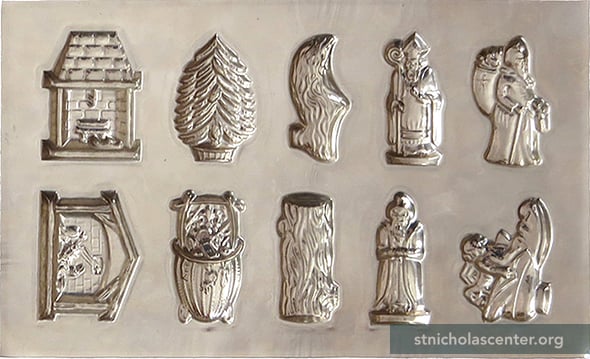 Chocolate Mold Létang Fils Paris, France circa 1913 Metal 7 7/8 × 4 7/8 inches1 3/4 inch figures #4523, mold introduced before 1913 10 flat molds (Father Christmas, Bishop Nicolas, wooden shoe, tree, fireplace, filled shoe, Belsnickel, log, basket, crèche)Figures made from the mold