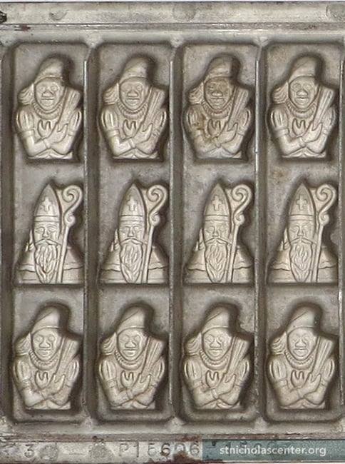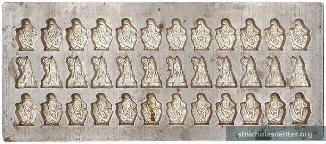 Chocolate Mold B.V. Vormenfabriek Tilburg, the Netherlands 1966 Metal 18 1/2 × 7 3/4 inches1 3/4 inch figures Two rows (24) of Piet holding switches; one row (12) of St. Nicholas with crozier #3 66 P15606-15607—this marking used on early molds after 1927 Click for reverse Click for detail Click for wax Sint ornament