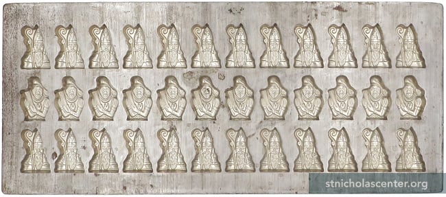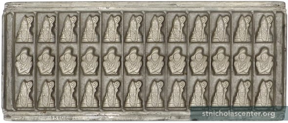 Chocolate Mold B.V. Vormenfabriek Tilburg, the Netherlands 1960 Metal 18 1/2 × 7 3/4 inches1 3/4 inch figures Two rows (24) of St. Nicholas with crozier; one row of Piet holding switches #7 60 P15606 7—this marking used on early molds after 1927 Click for reverse Click for detail Click for wax Sint ornament