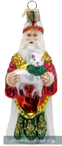 St Nicholas with Lamb Ornament Old World Christmas USA, made in China 2001 Blown glass 1 3/4 X 4 3/4 inches Click for back view