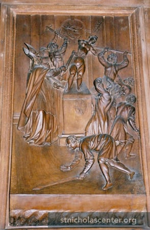 Relief Carving Church of S. Nicoló, the Lido of Venice, Italy Panels with scenes from the life of Nicholas: this one is destroying the Temple of Artemis Photo: St Nicholas Society/JMR