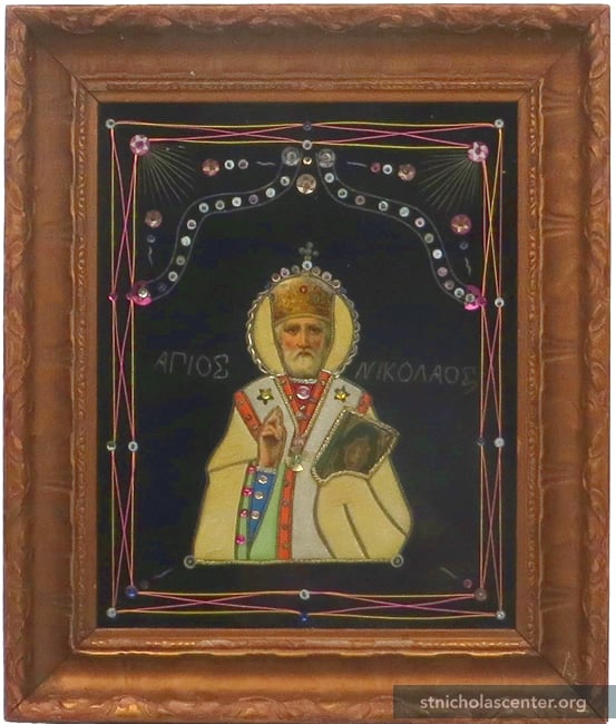 Agios Nikolaos Folk Art Icon Greece ca 1940s-1950s Black velvet, sequins, paper face, hands, book 9 1/2 × 12 inches Padded satin stitch embroidery with paper accents and sequins