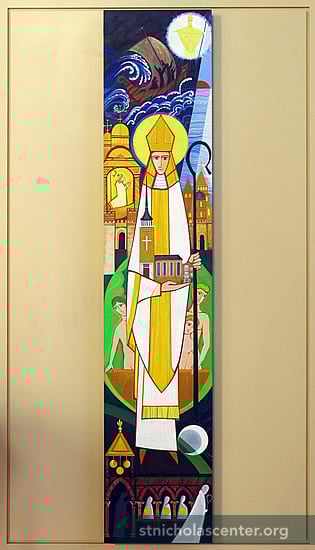 Saint Nicholas Icon Michael Coles St Nicholas' ChurchPoplar (Aberfeldly), London, England The contemporary icon is based on the stories in The Golden Legend.