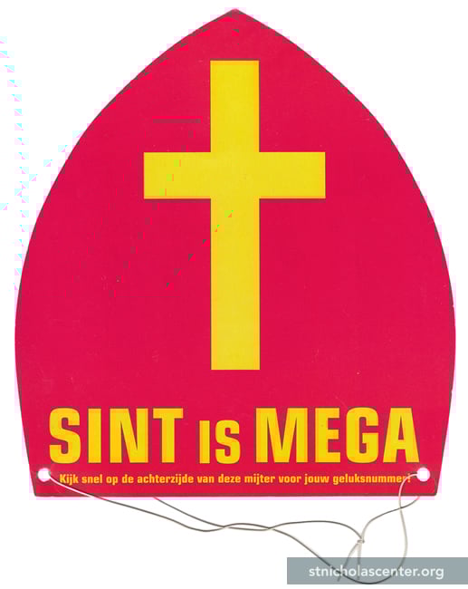 Sint is Mega Miter Intersport Megastore Alkmaar, the Netherlands 2009 Cardboard 7 7/8 × 8 5/8 inches Distributed at Sinterklaas' arrival, each with a number for a drawing each Saturday during Sinterklaas season