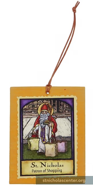 St. NicholasPatron of Shopping Ornament Barbara Barratt Kaleidoscope Designs Santa Fe, New Mexico 2007 Print mounted on wood, leather tie 3 × 4 inches