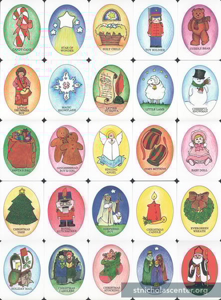 Deck of 49 cards with rules for variations of "Old Maid" (here St. Nick makes the winner, not the loser), "Fish" and "Memory." The cards have nice original seasonal pictures.