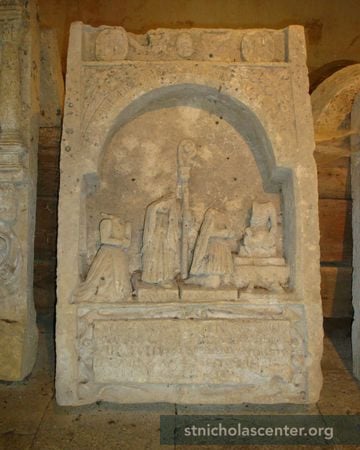 Relief Carving Chapelle Saint-Hilaire, Marville, France Damaged stone with St Nicolas with the crozier