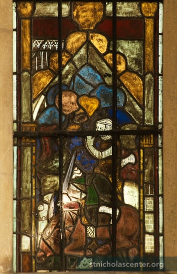 There are three Nicholas scenes on the left side of the large medieval 14th century east window in the south aisle Stapleton Chantry. The window is among the finest medieval glass in England.