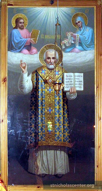 The icon was written for a Russian warship that took part in the Russo-Japanese war in 1904-05. During a battle an explosion threw the icon into the sea. Larger than a large door, the icon helped save a number of sailors who clung to it until they were taken on board a British warship.