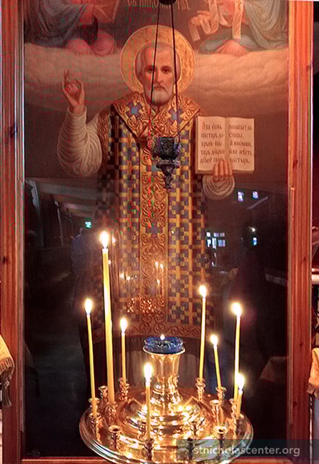 The icon had been commissioned by training squadron officers in 1891. It was brought from Russia to England in 1935 and presented to the Cathedral of the Dormition of the Mother of God, the Russian Orthodox church in London. The image, badly damaged from shellfire, was kept for many years in the church gallery. After restoration in the 1990s, the icon was again blessed and installed in the church on the eve of the 100th anniversary of the Russo-Japanese war.