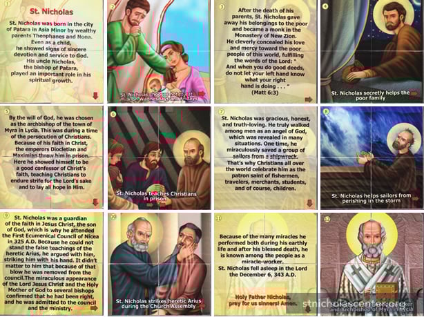 Lives of the Saints: St. Nicholas the Wonderworker Story Cube Orthodox Lighthouse Chicago, Illinoismade in Serbia 2014 Laminated, hinged cube 2 3/4 inche cube Cube tells the story of St. Nicholas, through six story panels and six illustrations. The cube opens and turns to follow the story. Click for panels
