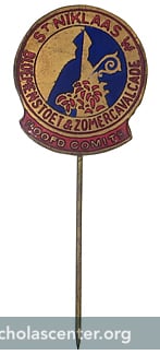 The badge is blue and gold for the colors of Waasland; St Nicolas is shown with flowers for the festival. The festival and parade were held from 1933 - 1939 and again from 1948 - 1970.