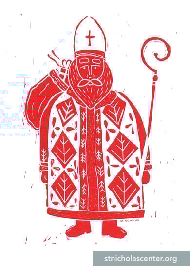 St. Nicholas Card Bonni van de Wouw Modern Vintage Lake Stevens, Washington 2025 Original linocut 4 1/2 x 6 1/4 inches Available from MpdernVintagebyBonni - Etsy
