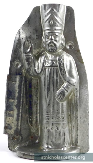 St Nicholas Chocolate Mold Anton Reiche Dresden, Germany ca 1920 German silver 3 x 5 inches #7668, a "7" at the topUnusual mold with open top for a separate plug, missing from this mold Click for back view
