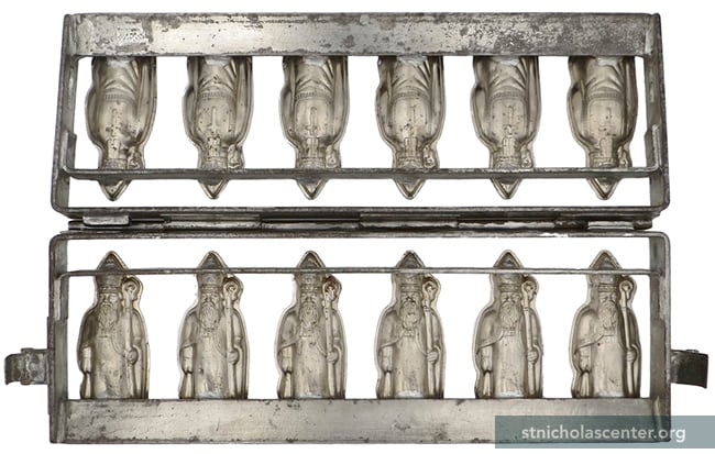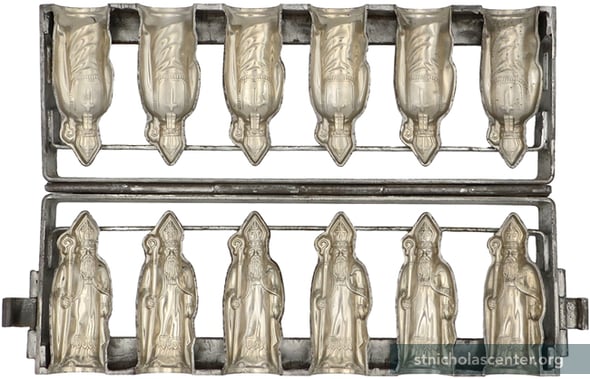 Chocolate Mold Europe Heavy metal 14 x 5 x 2 inches Heavy commercial mold with six standing figures welded to a hinged frame; when closed the molds can be filled from the bottom Click for back view