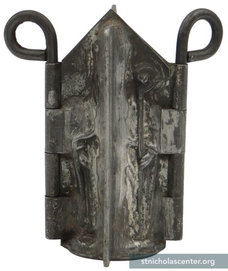 Chocolate Mold Létang Fils Paris, France Nickel 1 3/8 x 2 3/4 inches Hinged mold with pins; Mold #2 in an oval Click for closed view Click for wax figure
