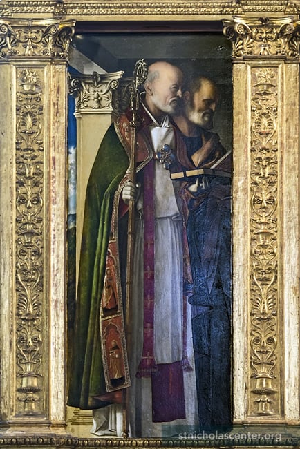 St Nicholas with Saint Peter, left side of triptych in the Sacristy: Madonna col Bambino con San Nicola di Bari, Pietro apostolo, Benedetto da Norcia e Marco Evangelista