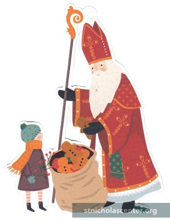 St Nicolas Gift Tag Gwenaelle Bernard Linette Superchouette Rennes, France 2023 Die cut stiff paper 3 x 4 1/4 inches