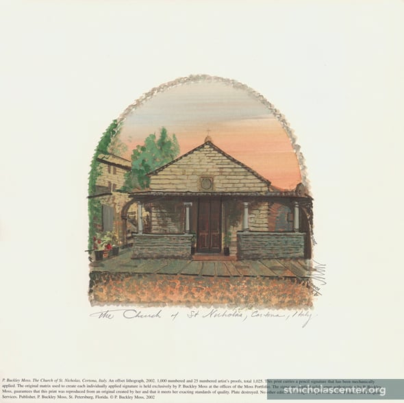 The Church of St. Nicholas Print P. Buckley-Moss Publisher P. Buckley-Moss St. Petersburg, Florida 2002 Offset lithograph 9 1/4 x 9 1/4 inches Chiesa di San Niccolo, Cortona, Tuscany, Italy The church dates to the 15th century Print #47/1000