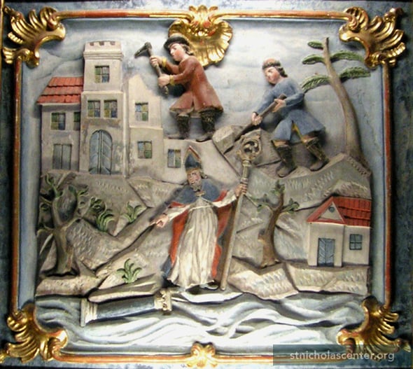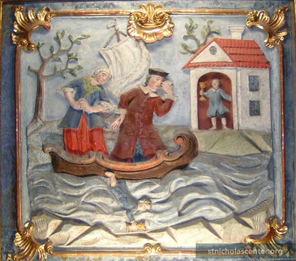Relief panels on the high altar: St Nicholas and the two golden chalices