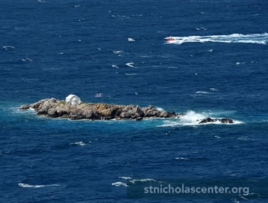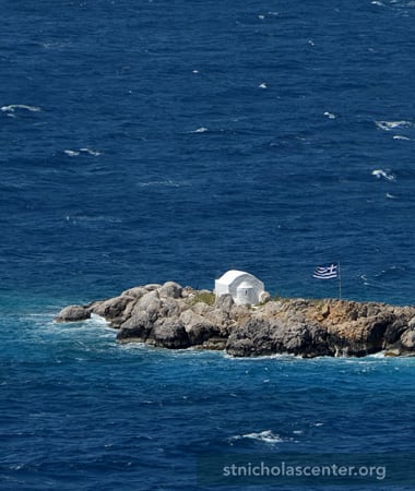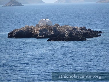 Agios Nikolaos Chapel Hydra Island Greece Greek Orthodox The tiny chapel is on a rocky reef just off Kamini Harbor on the coast of Hydra. The chapel is closed, but often used for weddings.