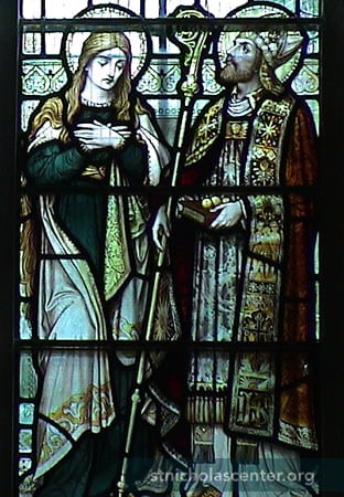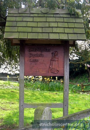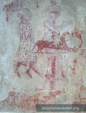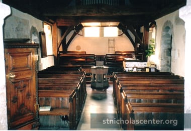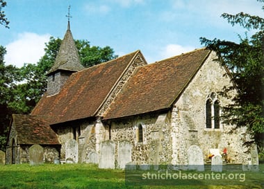 Pyrford means "the ford by the pear tree." The Norman church, built around AD 1140, has original red ochre frescoes that were uncovered during renovations in 1869 and 1967. They are from two periods and illustrate scenes from Christ's passion and pilgrims settiing off for Spain. The poet John Donne lived for a time in Pyrford and would have worshipped in St Nicholas.
