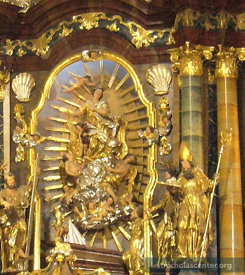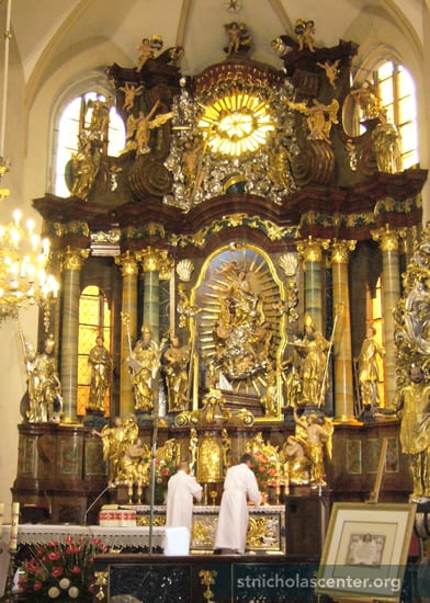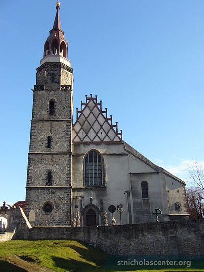 The church was the first to be built of brick here during the 1200s. It was destroyed in 1429 during the Hussite wars. A new church was then built; complete in 1492. The church was Protestant from 1524-1640. The whole town, including the church, burned down in 1642 during the Thirty Years' War. Reconstruction began slowly in 1655 as the church was again Catholic and most of the people were Protestant. The interior was transformed in Baroque style in the early 1700s. In 2004 it was given Sanctuary status.