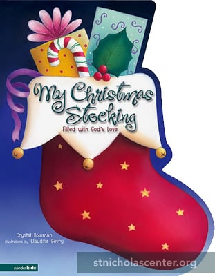 Shaped board book with simple introduction to Saint Nicholas and the stocking tradition; whimsical illustrations.Purchase from amazon.com, amazon.co.uk, amazon.ca