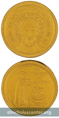 Chocolate gold coins with "St. Nicholas of Myra" on one side, Orthodox prayer on tag